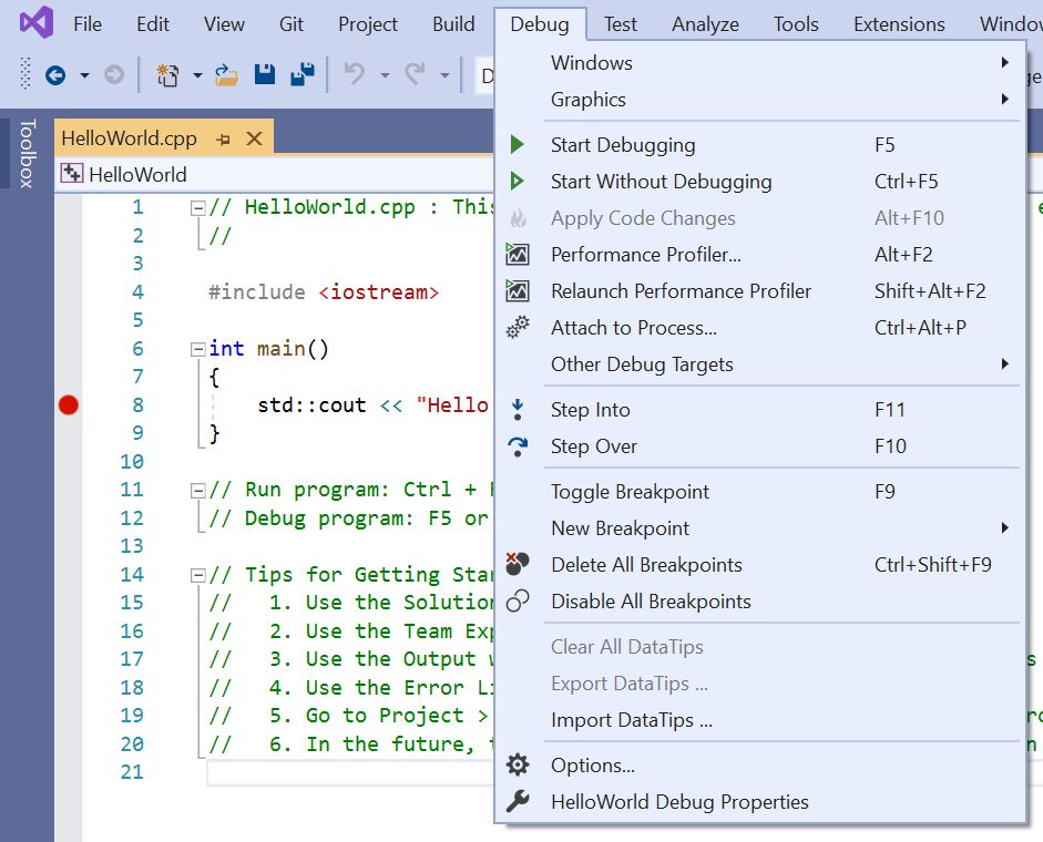 Using Visual Studio 2019 to debug commands