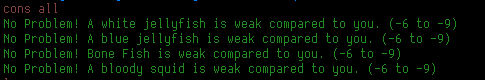 When you type "consider" (or "consider all") the lines are coloured to make it easier to tell high level from low level mobs.