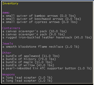 You can get a bit fancier if you like. This amended version breaks your inventory into categories, by matching on keywords in the inventory.