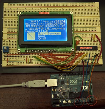 Rather than connecting up the 13 wires need for operation (8 data bits, plus 5 control lines), plus also power and ground, I decided to try to limit the number of connections to the Arduino to only four: Power (+5V), Ground, and the I2C data connections SDA and SCL. The end result is here, notice the four wires only connecting to the Arduino (circled):