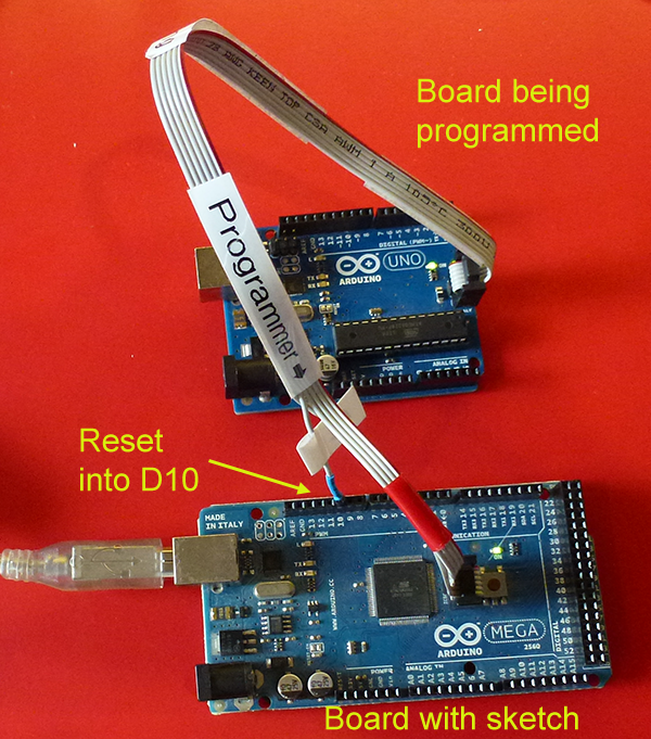 This wire (the reset signal) gets plugged into D10 on the Arduino with the programming sketch on it, as in the images below.