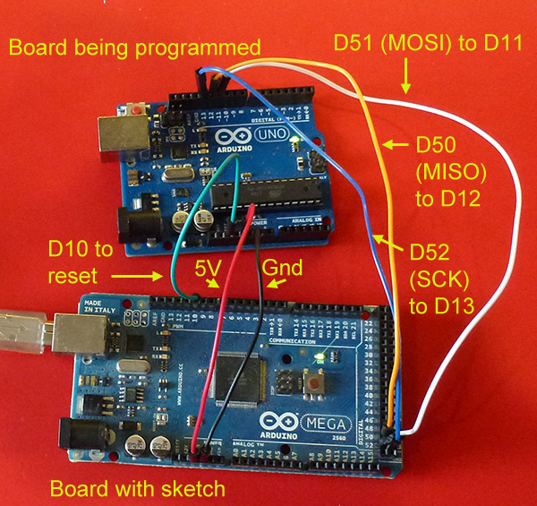 As for the Uno, you just connect the SPI headers together, except that pin 10 on the "programming" board is connected to Reset on the target board.