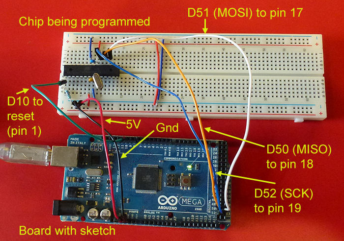 Connect the ICSP pins together as shown (Connect 1, 2, 3, 4, and 6). However connect pin 5 (reset) on the target board to pin D10 on the programming board. This is so that the programming board can keep the target board in reset, so that it can be programmed.