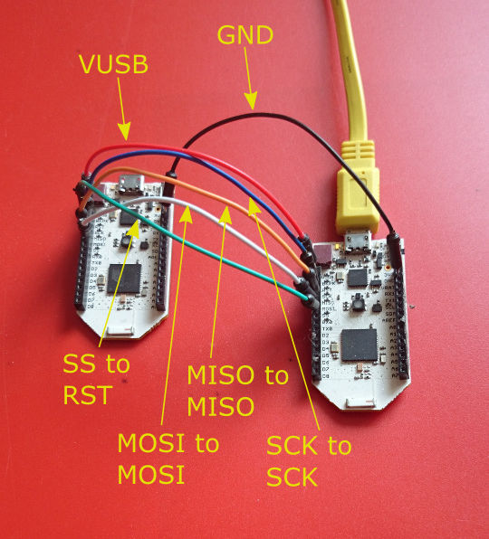 In the image below, the target is powered by connecting the VUSB pins together. Alternatively, you can just power the target board through USB as well (but still connect GND in this case). Remember that you cannot power a pinoccio board through the 3V3 pin, which is output only (and not enabled when running this sketch).