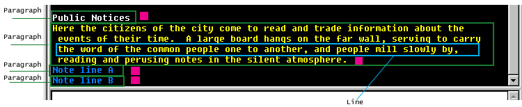 - Paragraphs, boxed in green (some are also single lines). Subsequent lines in a paragraph are indented (this is a configuration option).
