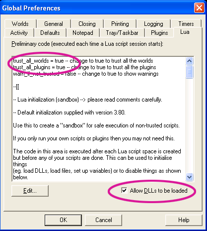 | | I have been a mushclient user for many many years now, I just ended up updating to the latest version after havint o do a OS reinstall. And Now i can't figure out how to get LUA to play nice with io.open. It keeps saying to look in the global prefrences, but I can't find nor change anything to make it work. Any help would be great | | Top |