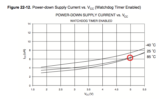 Power consumption when asleep (but with watchdog timer enabled): 6.66 µA.